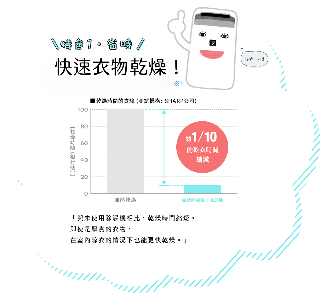 - ※1<乾燥時間縮短效果> ●試驗機構:ライオン株式会社●試驗方法:在室內乾燥環境下用一般洗滌劑清洗浴巾並風乾時)比較乾燥使用時的乾燥時間。■測試結果:當風乾時的乾燥時間設為100時,使用CV-J71時的乾燥時間縮短至9(自然乾燥:2,815分鐘⇒使用CV-J71:243分鐘)。測試條件●相當於8張榻榻米的房間大小●室溫20℃,濕度70% ●洗衣房:2條浴巾(100%棉) ●產品位置:安裝在洗衣房的下方和前面●驅動模式:衣物「高」烘乾、百葉窗「全開」運轉時、50Hz運轉時(衣物的實際烘乾時間會根據使用環境、使用條件以及衣物的材質和數量而有所不同)。