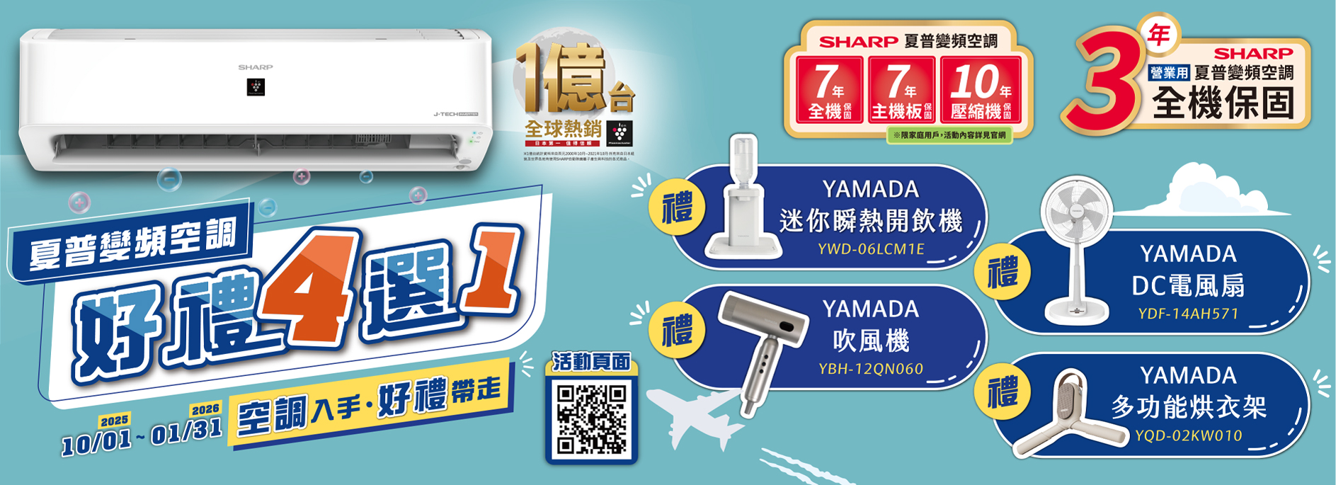 - 台灣夏普有權最終決定取消、終止、或暫停活動及贈品內容並保有修改活動細項之權利,詳情以官網公告為準。若需了解更多相關注意事項與說明,請至台灣夏普官方網站(tw.sharp),或來電客服專線0809-090-510(服務時間:週一~週日 09:00~21:00)