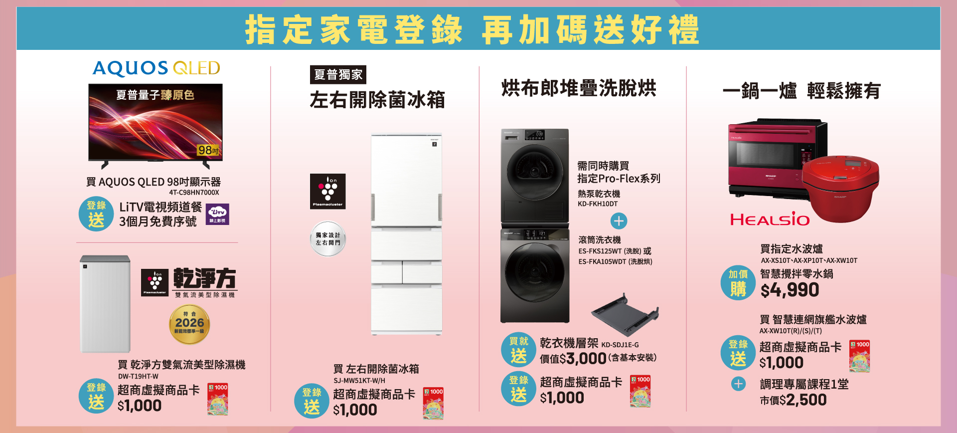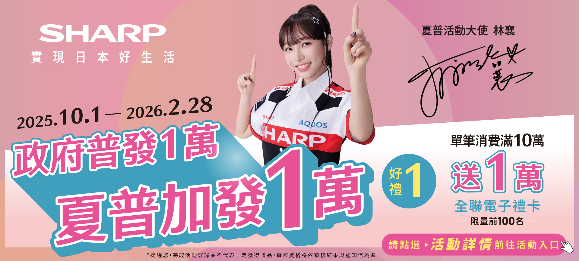 台灣夏普推出「指定家電登錄 再加碼送好禮」活動,凡於活動期間2025/10/01~2026/02/28 購買指定家電登錄送好禮!歡迎至全台各大通路選購。