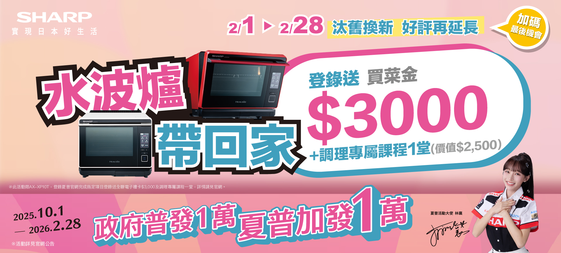 台灣夏普推出「水波爐 汰舊換新 年終大回饋」活動,凡於活動期間2025/11/01~2026/02/28 以水波爐或任意品牌蒸烤微波爐、蒸烤爐、蒸氣烤箱、氣炸鍋、微波爐等廚房調理家電換購SHARP水波...更多