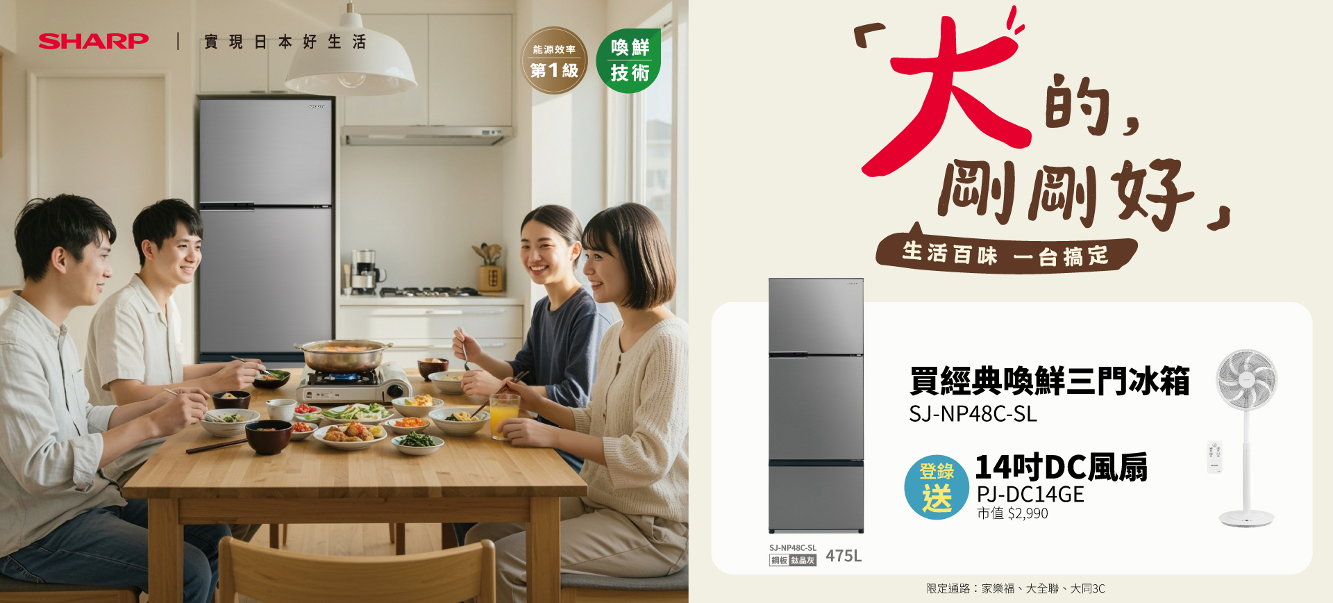 【限定通路】於家樂福、大全聯、大同3C通路購買經典喚鮮三門冰箱 (SJ-NP48C-SL),登錄保固贈 14 吋 DC 直流馬達立扇