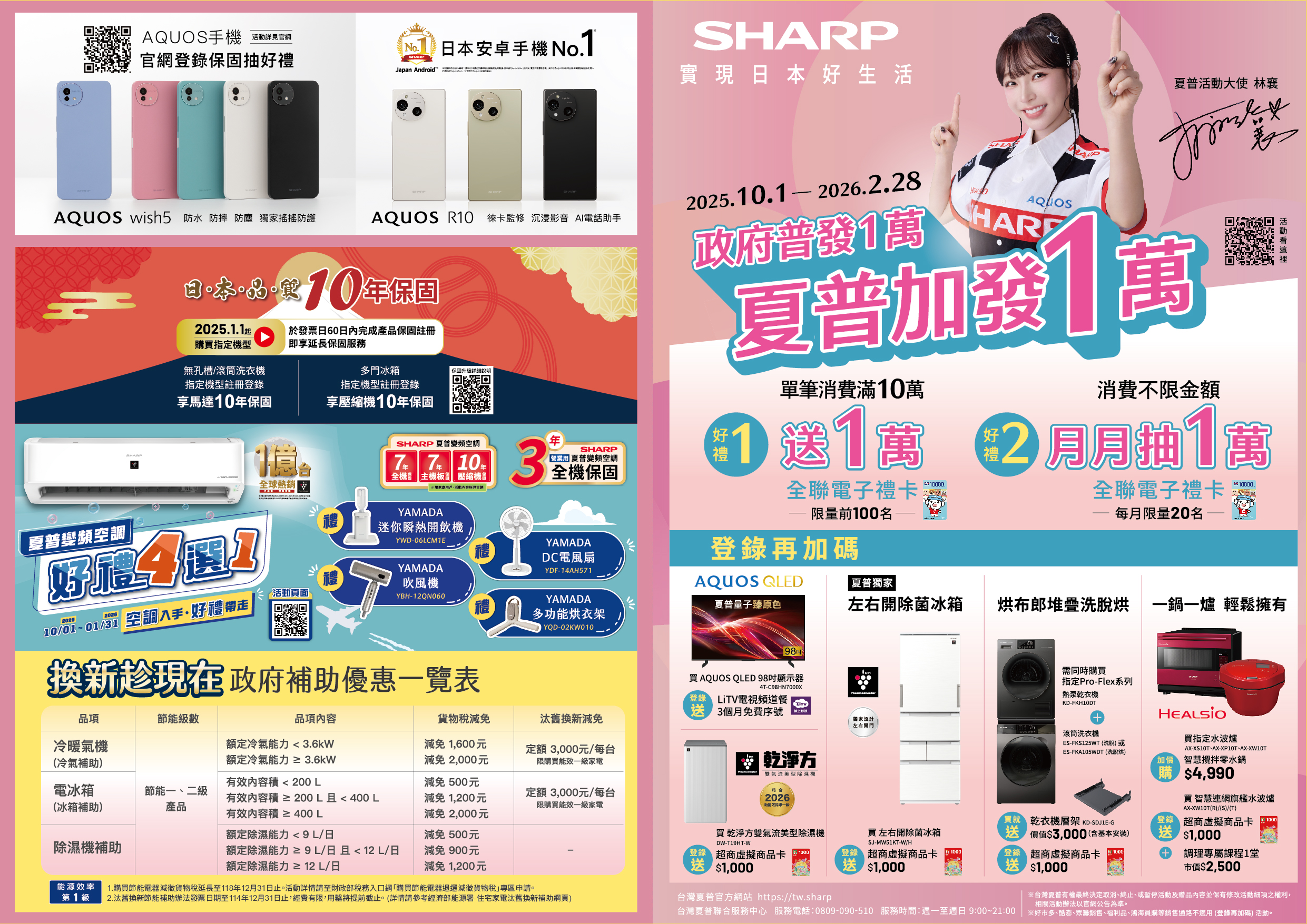 台灣夏普推出「政府普發1萬 夏普加發1萬」活動,凡於活動期間2025/10/01~2026/02/28 單筆消費滿10萬加發1萬,另外消費不限金額月月抽1萬,買指定家電登錄註冊還送好禮!歡迎至全台各大通路選購。