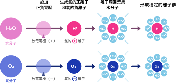 當對放電電極加上電壓進行電漿放電時,空氣中的水與氧便會產生氫正離子(H+)與氧負離子(O₂−)。