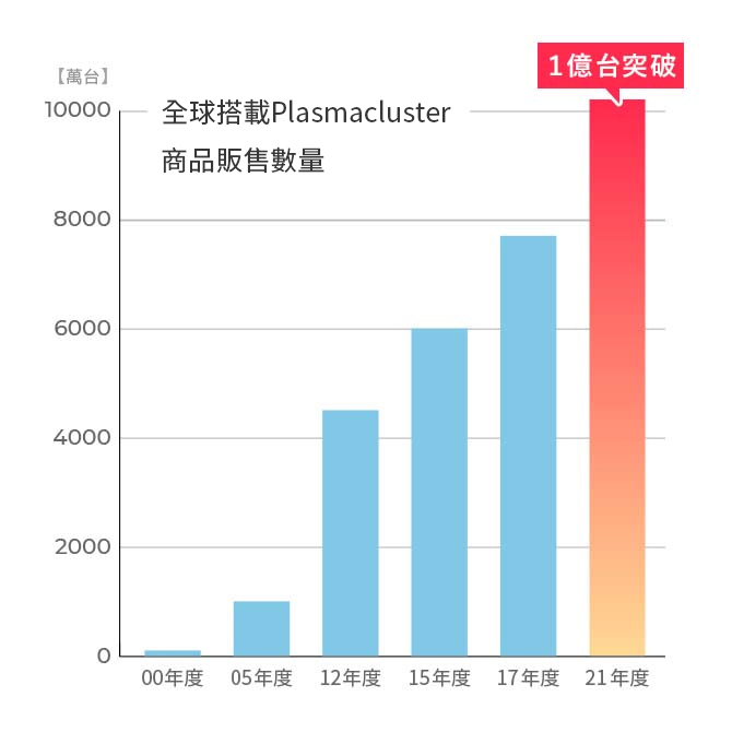 ※1億台統計資料來自西元2000年10月〜2021年10月,所有來自日本組裝及世界各地有使用SHARP自動除菌離子產生器與科技的各式商品。