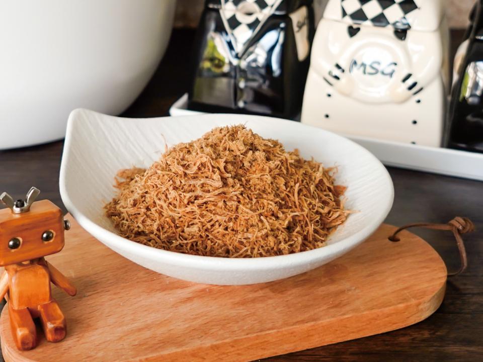 3.[雞肉鬆]:請先安裝攪拌器後,將撕碎的雞胸肉條+調味料放置內鍋中,設定[手動加熱]→[按喜好設定加熱] →[弱火]→[充分攪拌],→[1小時] →[啟動]。待行程結束再設定[手動加熱 à燉煮收汁行程à30分à啟動,完成後放涼即可裝罐。
